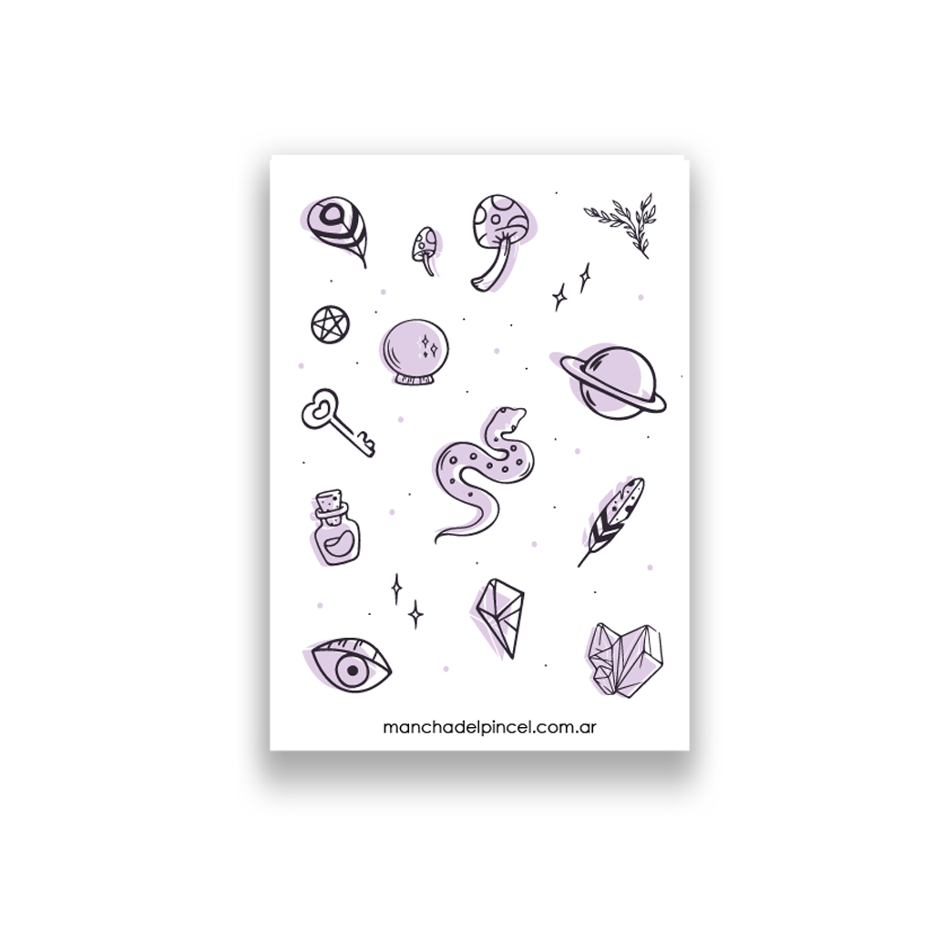 Plancha de stickers troquelados en papel autoadhesivo mate tamaño 15x21 cm diseño Esotericas Violeta