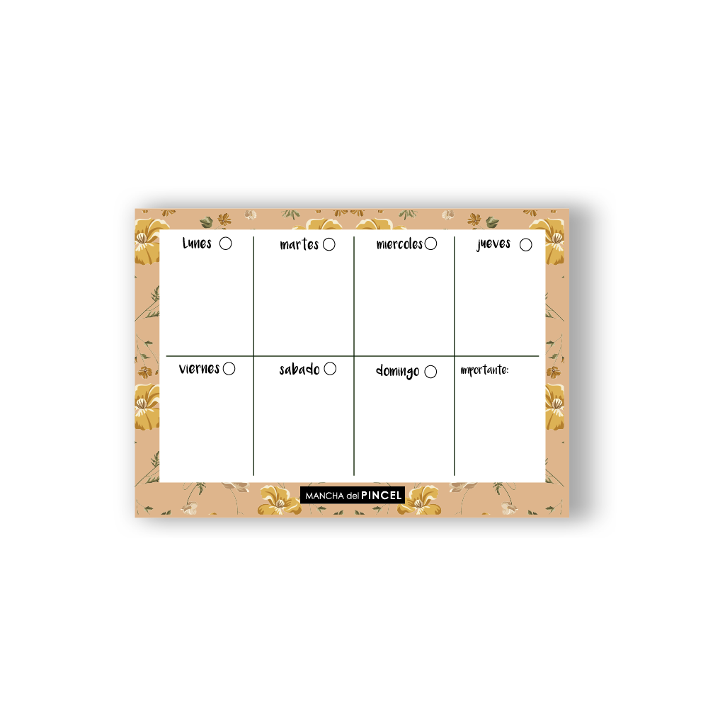 El Planificador Semanal de Papel Flores Amarillas A4 encolado aporta energía y claridad a tu organización semanal.