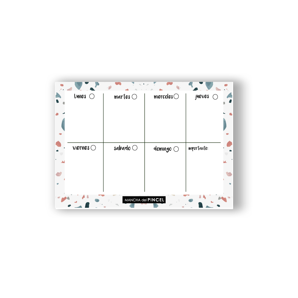 Organizá tu semana de forma clara y práctica con el Planificador Semanal de Papel Terrazo tamaño A4 encolado. Diseñado para ayudarte a visualizar todos los días en un solo espacio, es ideal para planificar tareas, comidas, estudio o trabajo.